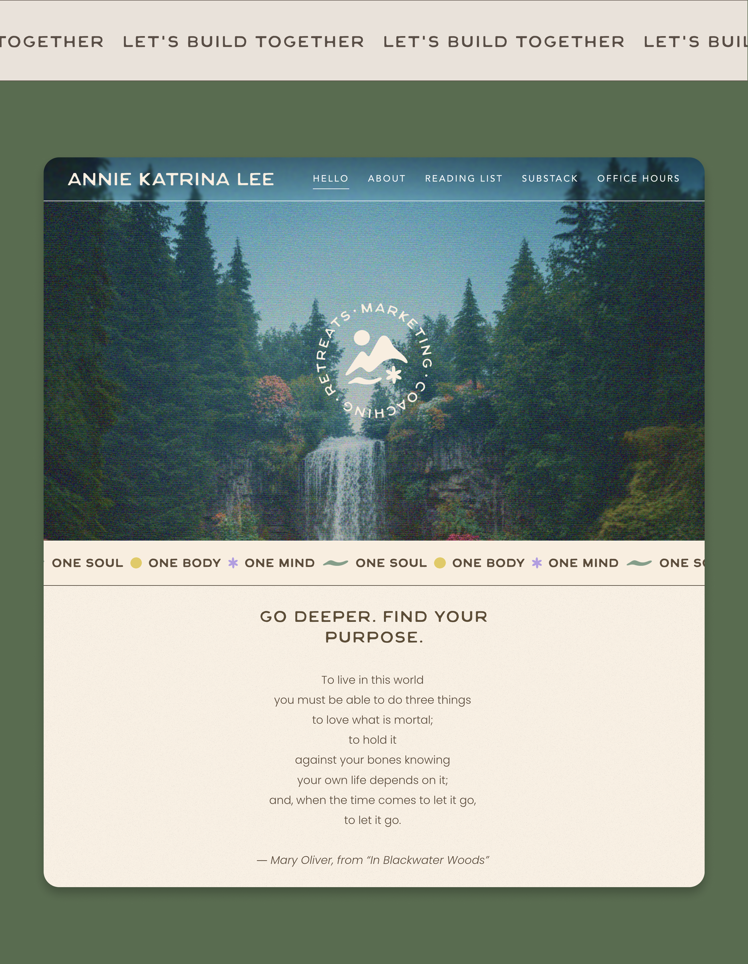 Annie Katrina Lee approached me as she entered a new chapter in her career. One rooted in experience, creativity, and mindful reinvention. The goal was to translate her multifaceted work in marketing, leadership, and wellness into a visual identity that felt both grounded and expansive.