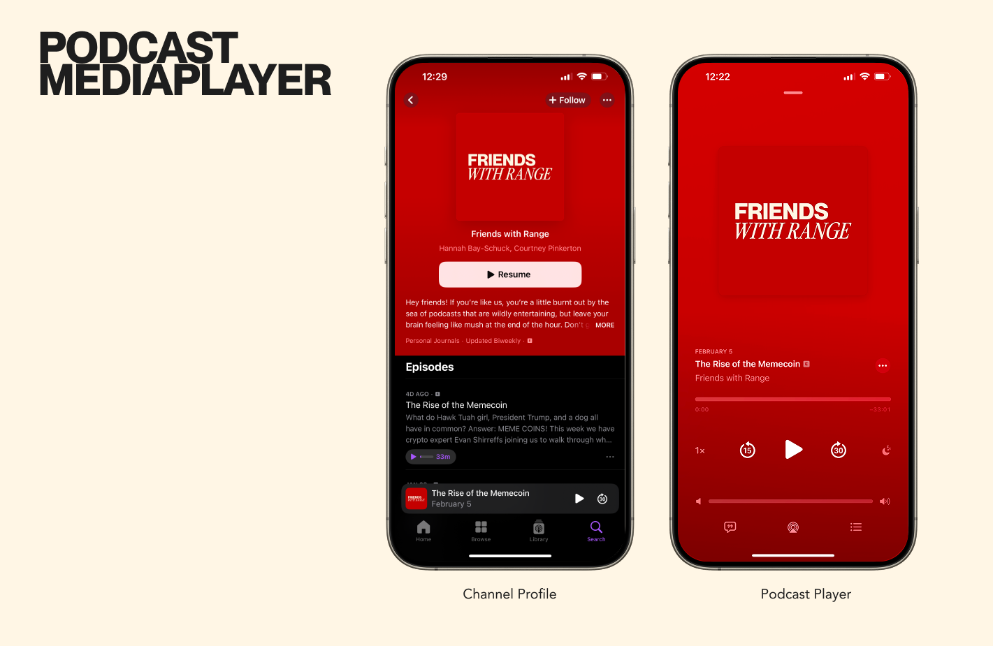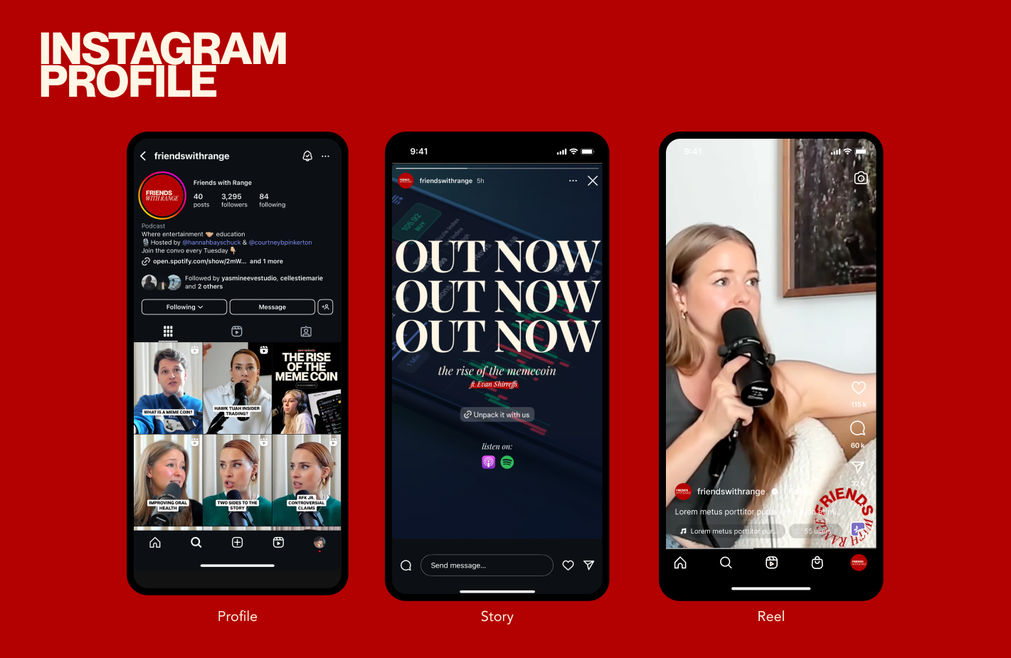 We opted for a bold red as the main color, bringing energy and confidence to the brand identity and making it memorable and attention-grabbing. The combination of the bold typography and striking color gave the podcast a powerful personality that stands out visually, while the playful serif italics hinted at the humor and lighthearted nature of the content.