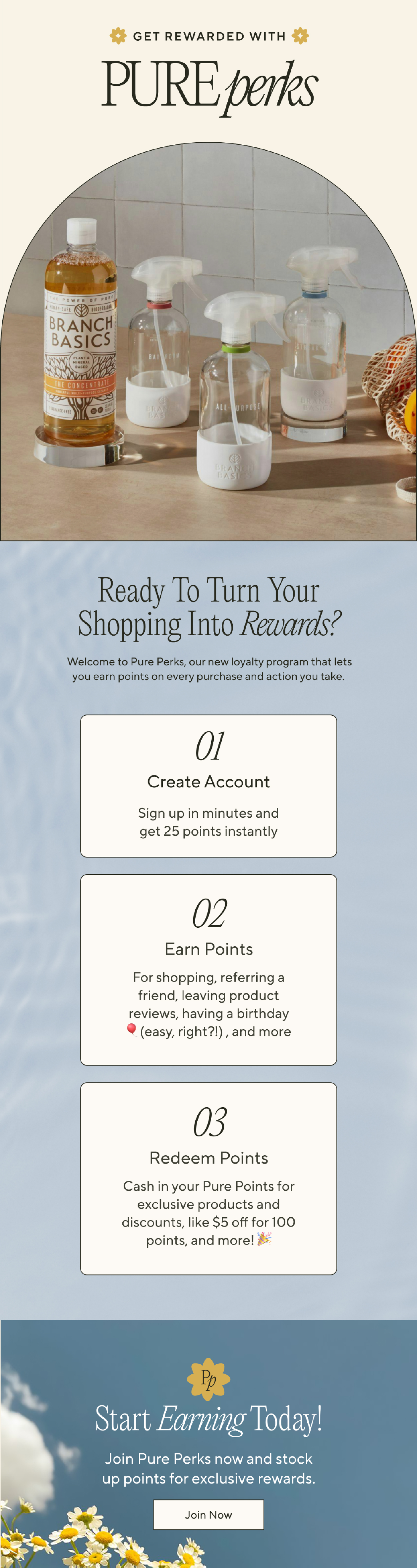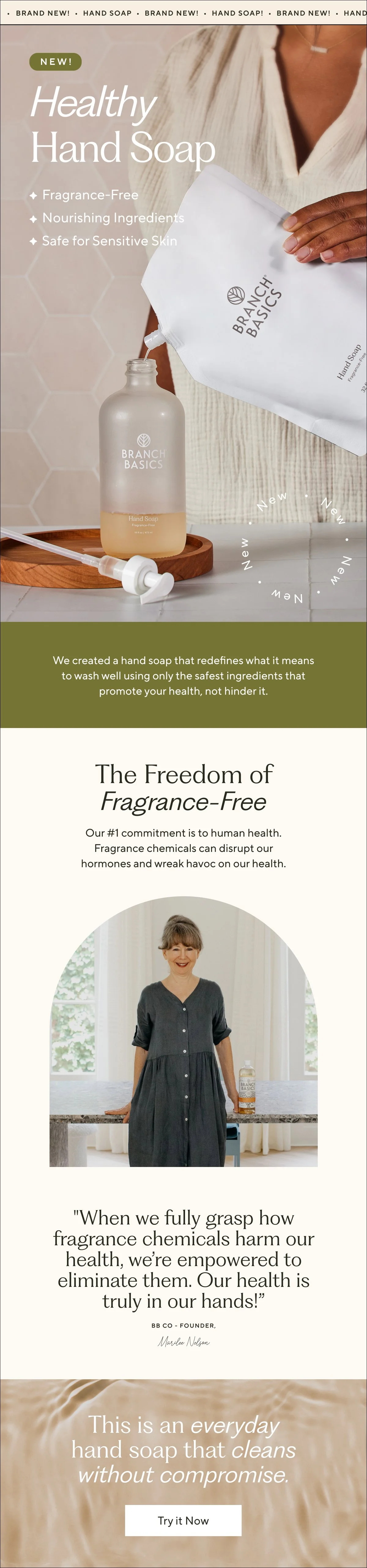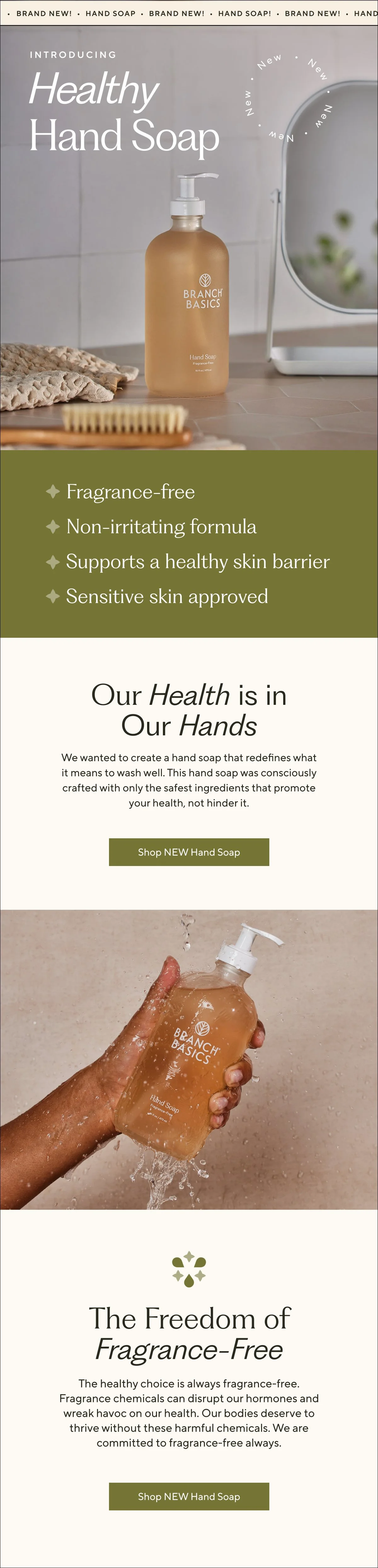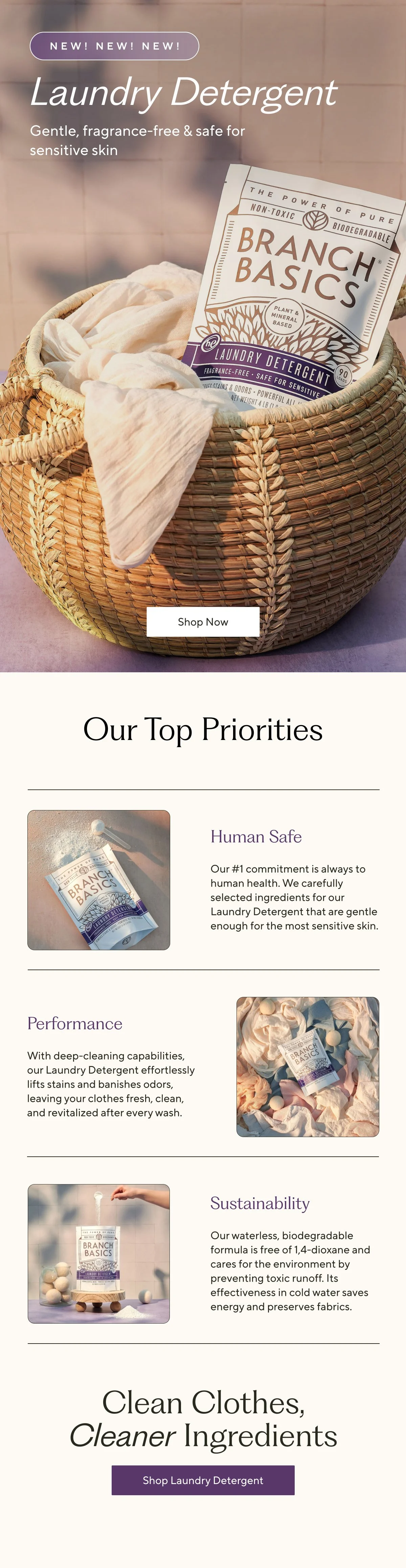 At Branch Basics, I led the visual direction for email marketing across product launches, seasonal promotions, educational flows, and paid social campaigns. I developed a responsive email template system in Figma, designed for seamless integration with Klaviyo and built to support both performance and brand consistency. These templates gave the team flexibility to update content quickly while maintaining a polished, cohesive look across touchpoints.