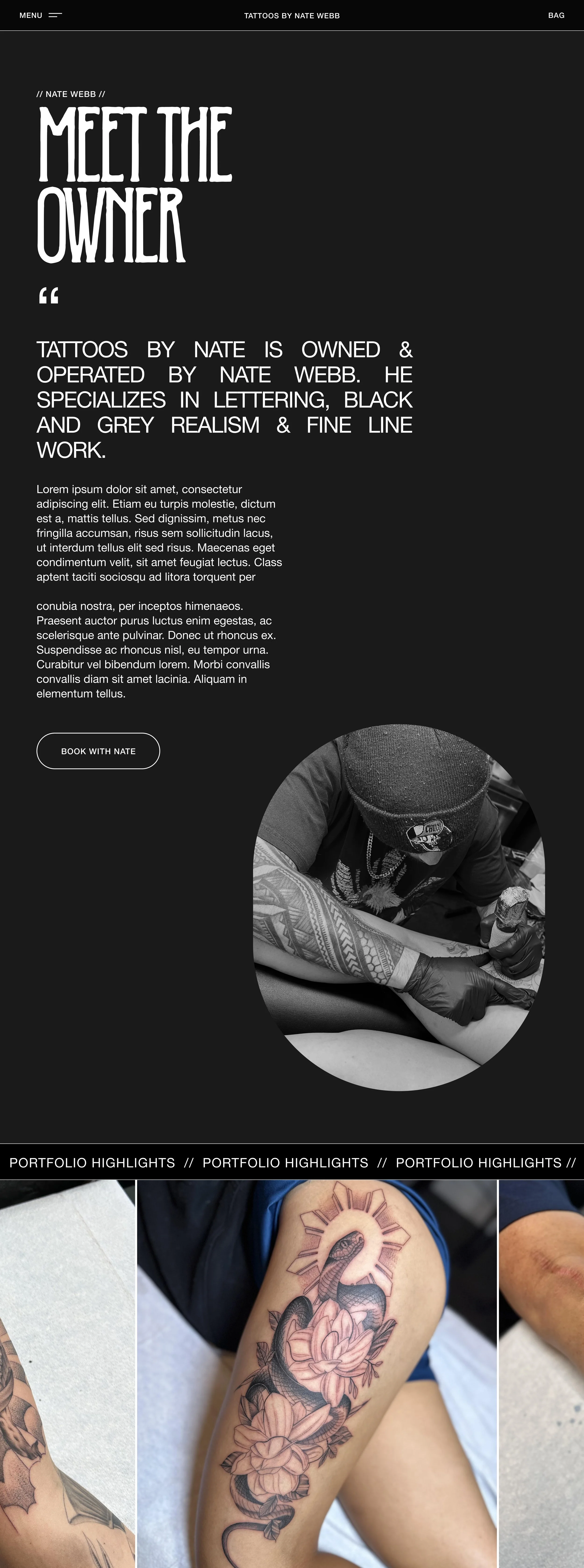 I partnered with a rising tattoo artist to develop his brand identity and online presence as he launched his new business. He sought a clean, modern design that would not only showcase his portfolio but also allow customers to easily shop for merchandise and book appointments. I designed a custom logo and built a fully responsive, user-friendly website on Squarespace.